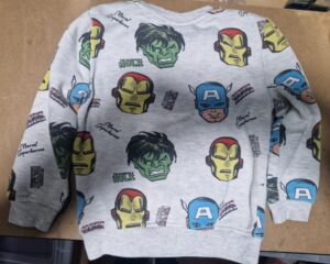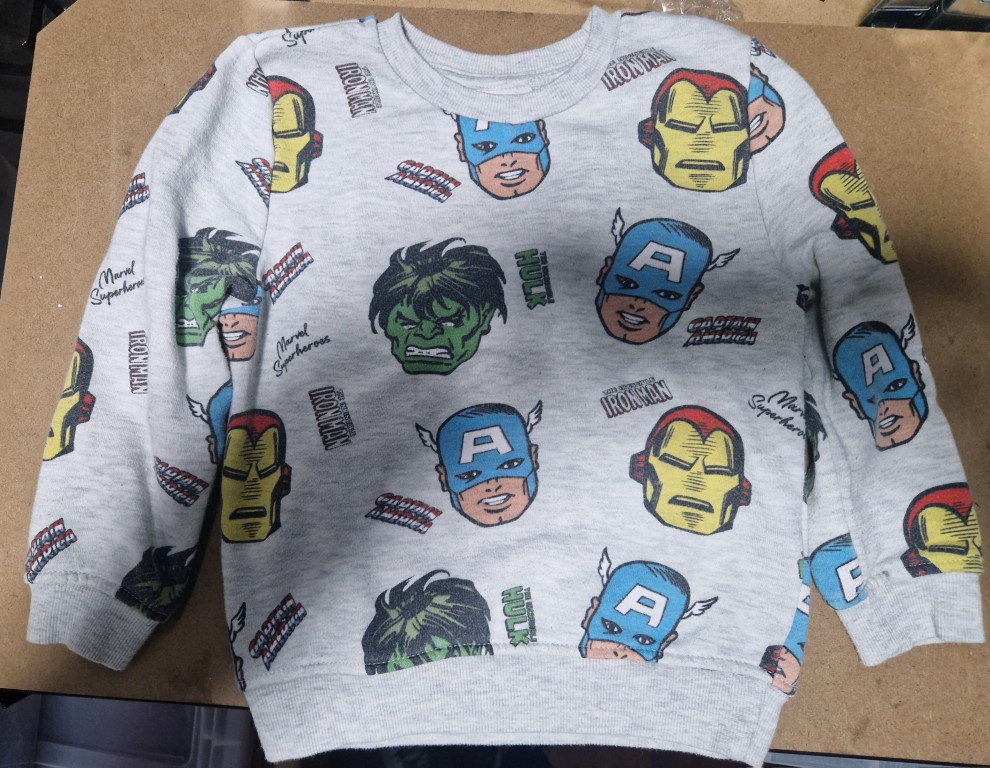 Leuke trui van Marvel met afbeeldingen van verschillende superhelden, zoals Iron Man, Captain America en Hulk. De trui is gedragen en heeft maat 110.