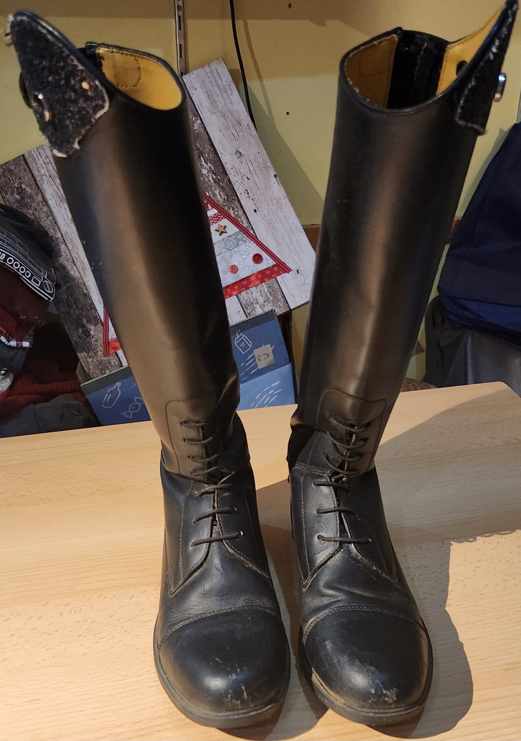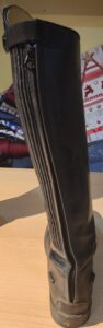 Gedragen paardrijlaarzen. Iets dof van kleur aan de kant waar je been tegen je paard zit. Rits is nog goed.